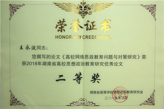 王永波老师撰写的论文《高校网络思政教育问题与对策研究》荣获2018年湖南省高校思想政治教育研究优秀论文二等奖