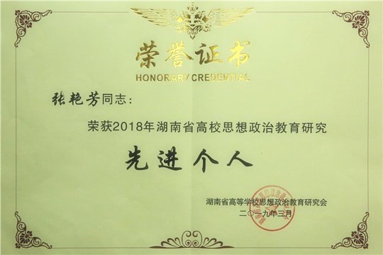张艳芳老师荣获2018年湖南省高校思想政治教育研究先进个人