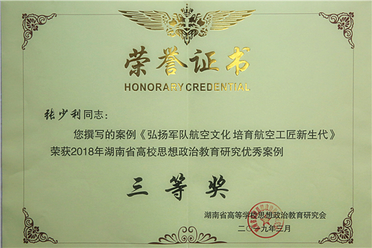 张少利老师撰写的案例《弘扬军队航空文化 培育航空工匠新生代》荣获2018年湖南省高校思想政治教育研究优秀案例三等奖