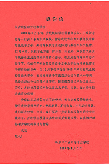 1月12日,我院收到冷水江工业中等专业学校送来的感谢信。冷水江工业中等专业学校是我院承接湖南省职业院校教师培训与考核工作委员会办公室组织的职业院校教师素质提高计划2018年贫困县和偏远地区学校精准培训的对象之一。