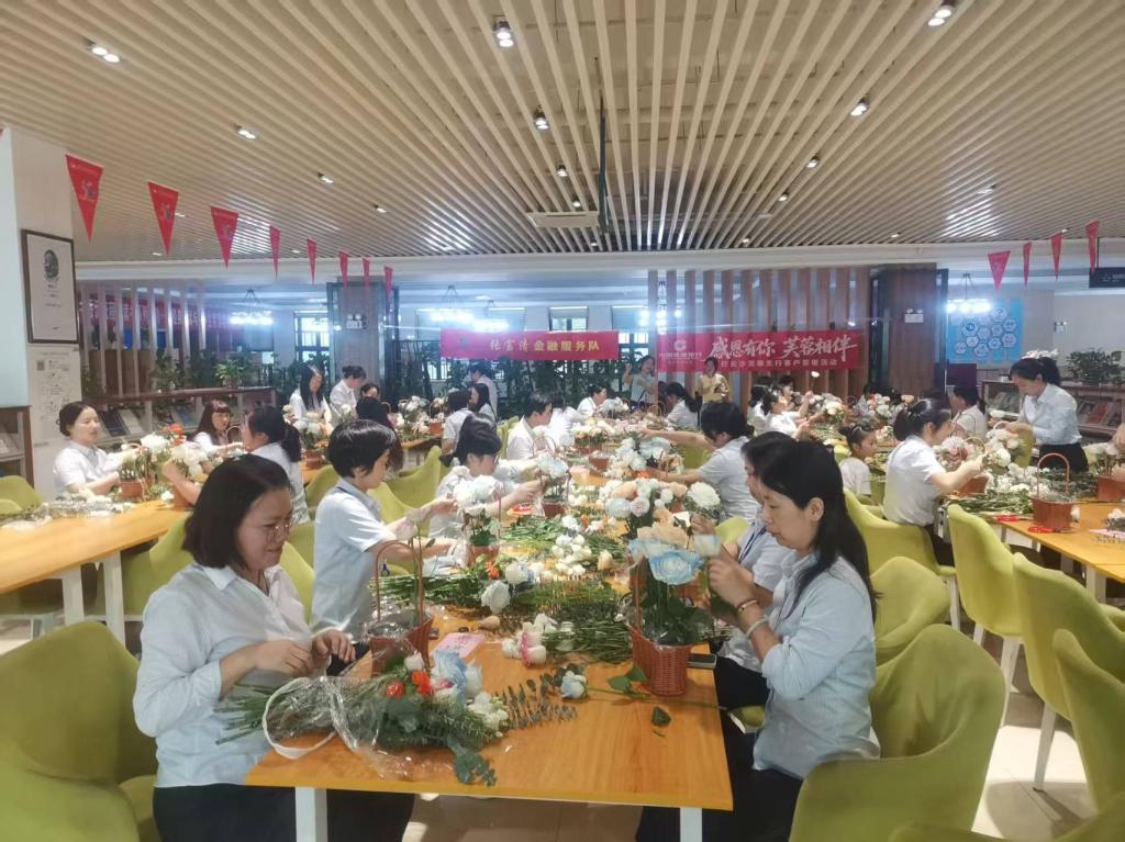 6月19日下午,图书馆一楼自修室花香四溢,气氛温馨浪漫。我院工会联合中国建设银行体育新城支行,在这里组织“相约建行、共赴美好”插花活动,25个单位近60名女职工共享一段与鲜花、与自己、与同事相处的美好时光。