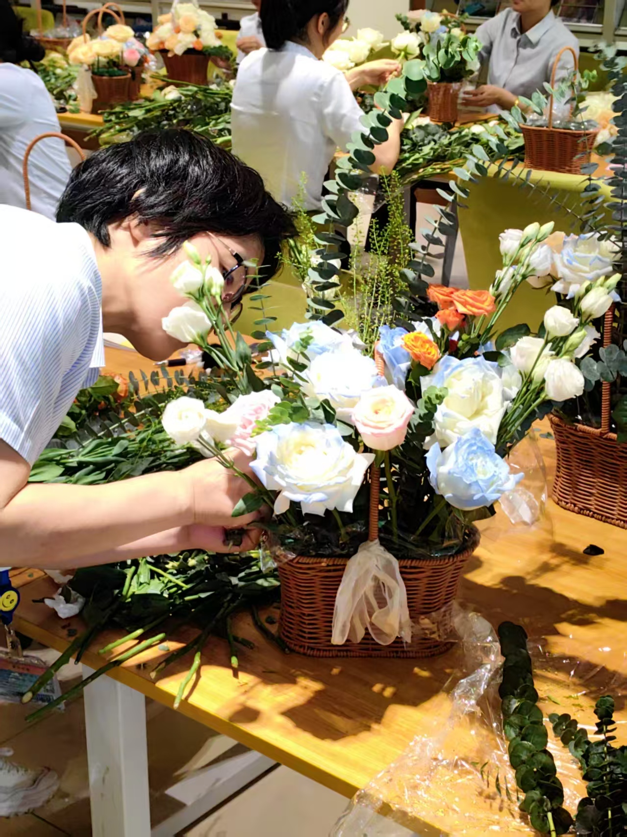 活动现场,花艺老师介绍了本次插花所用到的各类花材,细致讲解了不同花材的特点和寓意,着重传授了插花的基本技巧,包括色彩搭配、造型设计以及高低错落的层次安排等。在花艺师指导下,女职工们化身花艺师,充分发挥自己的想象力和创造力,精心挑选花材,认真修剪枝叶,用心搭配色彩,将原本普通的花材组合成了一个个独具匠心的花艺作品。现场氛围热烈而融洽,参与者们不时交流心得、互相欣赏作品,欢声笑语不断。