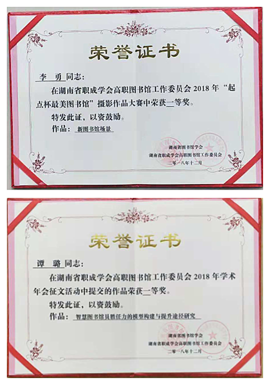本次年会围绕“新思想、新起点、新征程——馆员的培养与成长”的主题开展了湖南省职成学会高职图书馆工作委员会2018年学术年会征文活动。我院图书馆谭璐老师撰写的《智慧图书馆员胜任力的模型构建与提升途径研究》、左珊老师撰写的《“双一流”建设背景下高职图书馆青年馆员职业能力提升策略研究》分别荣获一等奖、二等奖。