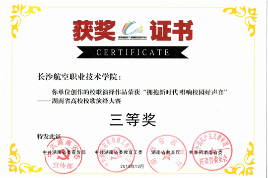 12月28日下午,湖南省第五届校园文化论坛暨全省高校校歌系列主题活动颁奖典礼举行,我院校歌演绎作品《托起战鹰的翅膀》获三等奖,校歌故事征文《蓝天之子,蓝色的梦》获优秀奖,我院党委副书记兼纪委书记蔡海鹏出席典礼并上台领奖。