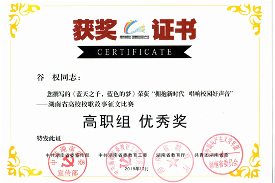 谷权同学作品获“拥抱新时代 唱响校园好声音”——湖南省高校校歌故事征文比赛高职组优秀奖