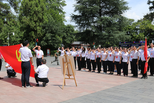 在红军烈士陵园,全体党员向革命先烈敬献了花篮,在纪念碑前,全体党员面对鲜红的党旗,高举右手,在蔡海鹏副书记的带领下庄严宣誓,重温入党誓词,铮铮誓言,是新时代的共产党员对革命先烈们许下的庄严承诺,牢固树立起不忘初心、牢记使命的责任担当。