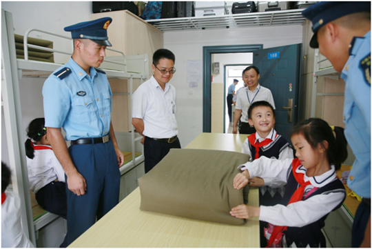 参观完航空馆和停机坪后,小朋友们来到了士官学院营区。首先是介绍宣传栏里英模人物事迹,让小朋友永远铭记现在的幸福生活是无数革命先烈牺牲奉献换来的。而后进入学员宿舍,小朋友们立即被眼前整齐划一、直线加方块的内务设置所折服,为真切体会部队的生活,学员们教小朋友一起开始了制作“豆腐块”行动,培养他们动手叠被子的好习惯。在航模演示现场,学员们以娴熟过硬的操控技能,赢得了小朋友们的阵阵喝彩,并现场教他们实现“蓝天”梦。紧接着,小朋友们观摩了学员们精彩的队列表演,接受队列训练,跟着学员一起激情昂扬地喊出“参军光荣、祖国伟大”的口号。而后在最为精彩刺激的模拟轻武器操作与射击场,小朋友们在学员的指导下,认真学习瞄准、击发动作,过了一把“当兵瘾”,有的小朋友竟然也命中了10环,那种兴奋之情溢于言表。活动进行到最后,学生代表现场进行了诗歌朗诵,讴歌了对军人的崇敬,表达了对军队的向往,将活动推向了又一个高潮。许多小朋友们纷纷表示,今年的“六一”儿童节过得很有意义,以后要好好学习,将来长大了参军入伍、保卫祖国。
