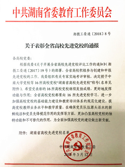 3月22日,湖南省高等学校党校工作暨党校教育研究会2017年会在永州召开。我院被湖南省教育工委授予“湖南省高校先进党校”荣誉称号,全省有11所本科院校、5所高职院校获此殊荣。