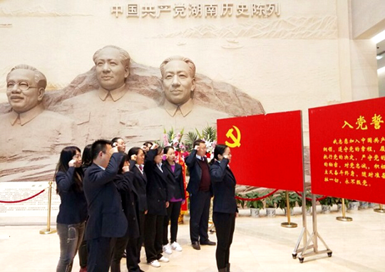 在讲解员的引导下,支部全体党员参观了湖南党史陈列馆展厅。一段段珍贵的文字,一幅幅泛黄的老照片,一件件承载了历史记忆的文物,立体、生动、形象地展示了中国共产党在湖南波澜壮阔而又绚丽多彩的光辉历史。一路走、一路看,这部“走着读”的湖南地方党史,让大家深受感染和震撼。在参观的最后,全体党员在党旗下重温入党誓词,庄严肃穆的宣誓活动,使每一位党员再一次接受心灵的洗礼。