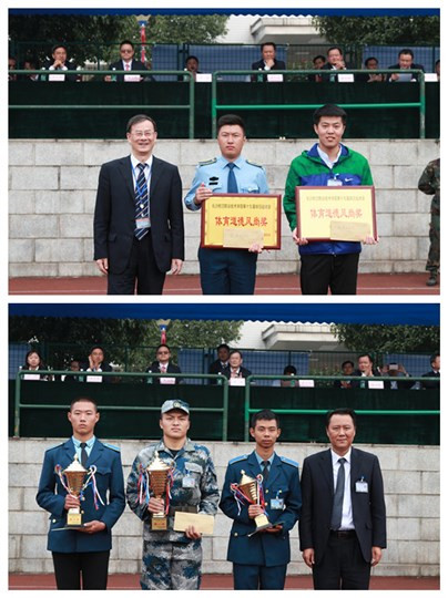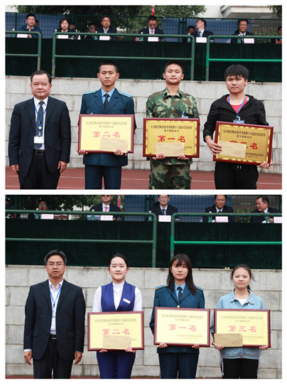 运动场上,来自我院6个二级学院的739名体育健儿共进行了26个比赛项目的激烈角逐,各项比赛井井有条、激烈精彩。整个运动场上始终洋溢着竞争、拼搏、团结、友爱的美好气氛。全体运动员勇敢顽强、力争上游;全体裁判员严肃认真、恪尽职守;全体工作人员兢兢业业、多方协作;全体观众热情文明、参与配合。特别是各部门领导高度重视,亲临竞赛现场,组织、协调运动员比赛,表现出了强烈的责任感和荣誉感。最终,士官学院、基础教育学院和机电学院分别获得团队总分的前三名,士官学院、基础教育学院分别摘夺男子、女子团体总分第一名,电子学院和机电学院荣获体育道德风尚奖。另外,此次运动会上共有11人次刷新了5项校运会记录。