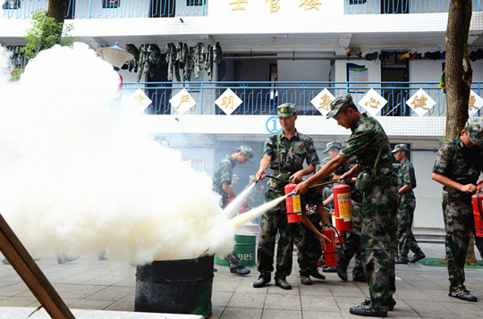 在消防演练现场,只见浓烟滚滚,一到三楼参加演练实施的同学用湿毛巾捂住口鼻紧张有序的组织撤离。紧接着随行教员现场介绍了粉尘灭火器的使用方法,新生营各班选派代表体验了灭火器的操作和使用。