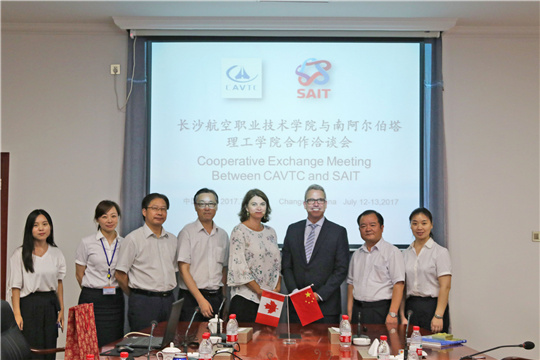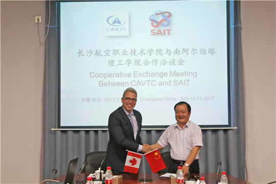 随后,双方在跳马校区办公楼二楼进行交流会谈,陈湘黔副院长代表学院对远道而来的客人表示热烈的欢迎。会上,双方分别就各自院校的基本情况作了简要介绍,并就可能合作的项目和领域做了初步交流。 当天下午,双方在培训中心就开展教育合作进行正式洽谈。陈湘黔副院长表示,我院非常乐意和来自世界各地的优秀院校合作,开展管理人员、师生之间的交流,进行专业、课程、培训、科研等方面的合作。这对实现双方院校的互利互赢、提高学院的办学水平和国际影响力大有裨益。SAIT代表对我方的观点表示认同,并正式邀请我院领导、教师前往考察和交流。 会谈中,双方商定将SAIT的航空电子技术(我院为飞机电子设备维修)确定为合作办学专业,并就教育模式、文凭颁发、办学规模、录取条件等有关问题交换了意见,在课程设置、课程考核标准等方面进行了深入交流。SAIT表示,除了探讨合作办学项目之外,师资培训是该院特色项目,SAIT愿意对我院的师资给予支持。最后基于讨论的结果,双方院校签订了谅解备忘录。会议在愉快友好的气氛中结束,双方合影留念并互赠礼品。Mr. Miller一行的来访加深了合作双方的相互了解,增进了友谊,对中加职业教育合作与发展具有积极影响。