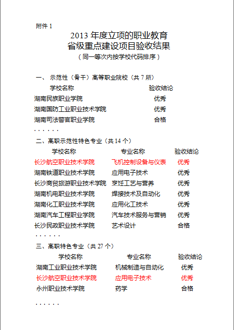 4月1日,湖南省教育厅《关于2013年度职业教育省级重点建设项目验收结果的通报》(〔2017〕109号)公布我院省级示范性特色专业飞机电子设备维修(原名飞机控制设备与仪表)和省级特色专业应用电子技术两个专业均以优秀等级通过验收。去年年底,省教育厅组织专家对2013年度立项的职业教育省级重点建设项目进行验收。经过网上评审、部分项目现场考察、教育厅审核、结果公示等环节,最终确定14个省级示范性特色专业和27个省级特色专业通过验收,其中获得优秀等级的分别为6个和2个。