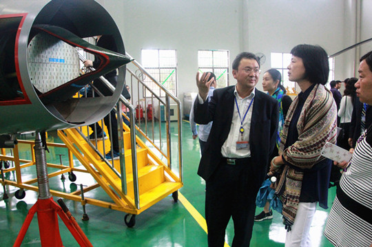 来访者一行在我院朱国军院长助理陪同下参观了飞机展示坪、飞机陈列馆、校内实训中心等场所。随后,在第一学术报告厅举行座谈,就学院专业建设、校企合作等方面进行交流。朱院助主要介绍了学院对接产业办专业、依托行业建专业、校企合作育人才的具体做法与典型经验,重点讲述了学院实现专业集群发展,建设四大专业群,构建“三个三分之一”的人才培养格局等内容。此外,与来访者进行了现场互动。