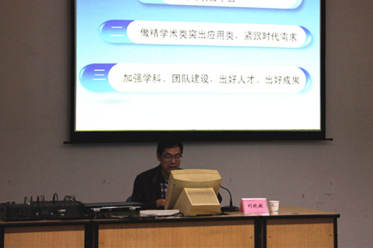 10月28日下午,省社科联巡视员、省科研管理工作者协会会长刘晓敏研究员一行来我院进行参观交流研讨活动。刘晓敏研究员应邀在我院第一学术报告厅作《关于湖南省社科评审委项目申报的几个问题》专题讲座。曾全胜副院长主持会议,蔡海鹏副书记出席,政治部、学生处、职教中心、各二级学院有意申报相关科研项目的70余名教师聆听了讲座。