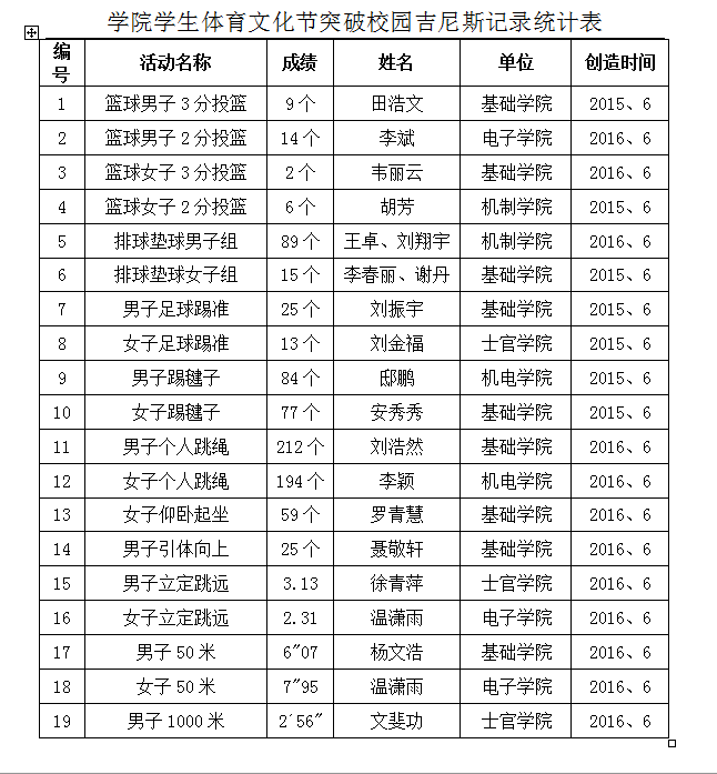 6月16日下午,我院2016年学院学生体育文化节校园吉尼斯比赛暨闭幕式在跳马落下帷幕。各二级学院参赛队员通过19个项目的激烈角逐,最终,男、女跳绳比赛、男、女踢毽子比赛,男、女传垫排球,男、女足球传准比赛,男、女篮球2分投篮比赛,男、女篮球3分投篮比赛,男、女立定跳远,男子、女子50米,男子1000米,男子引体向上,女子仰卧起坐等项目前八名尘埃落定,其中,文斐功等同学在1000米等12个比赛项目上创造了我院吉尼斯纪录。