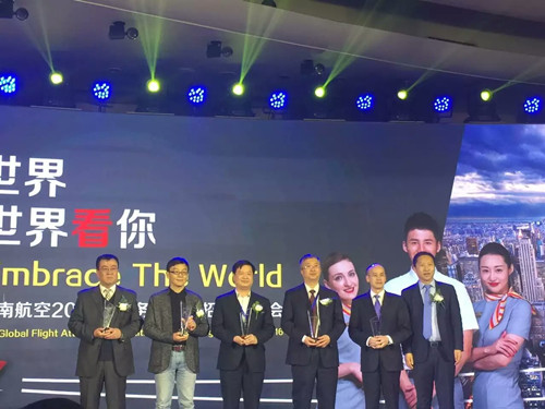 海航授予我院“最佳合作潜力院校”,我院航空服务与管理学院院长彭圣文上台领取荣誉