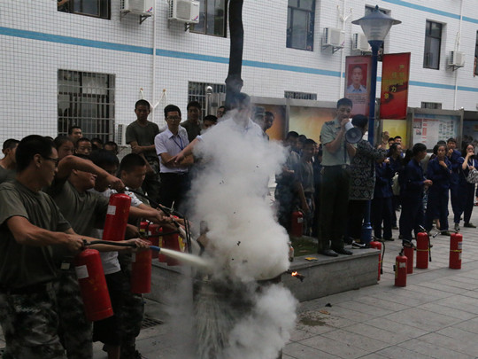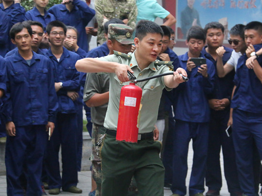 同学们在教官指导下进行模拟初起火灾扑救演习