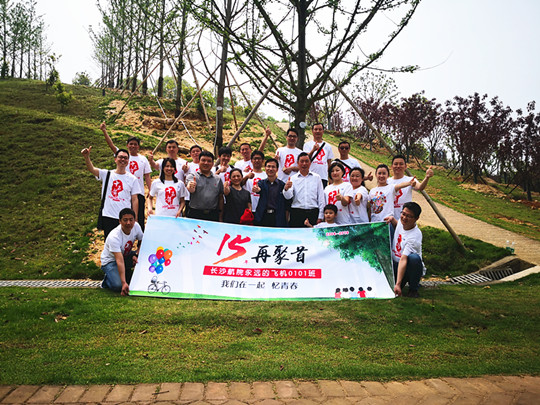 飞机0101班校友在认领的银杏树前合影留念