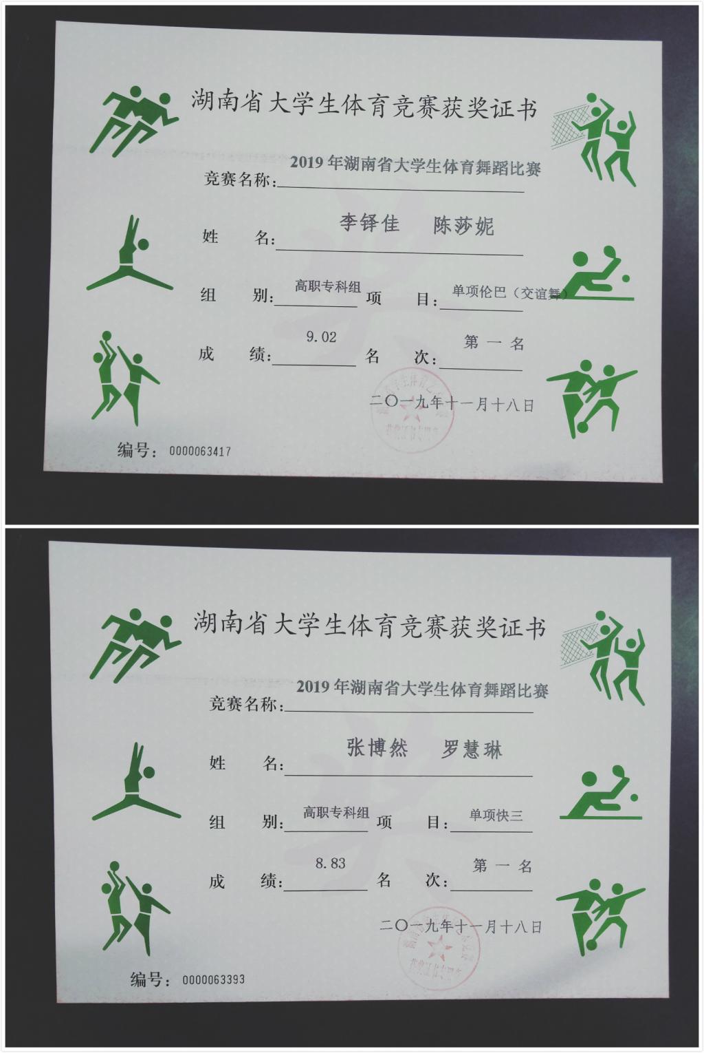 11月16日至18日,由湖南省教育厅主办的“2019年湖南省大学生体育舞蹈比赛”在湖南科技大学举行。我院体育舞蹈队共6人参加了体育舞蹈各项目比赛。经过三天的激烈角逐,李铎佳和陈莎妮同学获得了单项莎尔莎舞和单项伦巴舞两个第一名;张博然和罗慧琳同学获得了单项快三舞和单项慢三舞两个第一名;杜思情同学获得单人单项伦巴舞和桑巴舞两个第二名;宋瑾婷同学获得单人单项恰恰舞第五名和伦巴舞第六名。体育舞蹈代表队以四金两银的成绩获得团体总分第四名的好成绩。