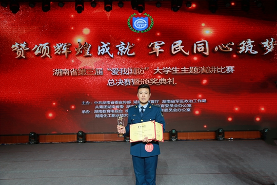 11月30日,湖南省第三届“爱我国防”大学生主题演讲比赛总决赛暨颁奖典礼在株洲举行。参加总决赛的12组选手经过激烈角逐,我院士官学院学生时振鹏获大赛二等奖