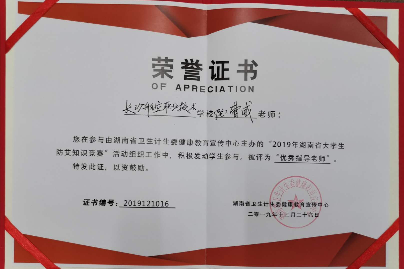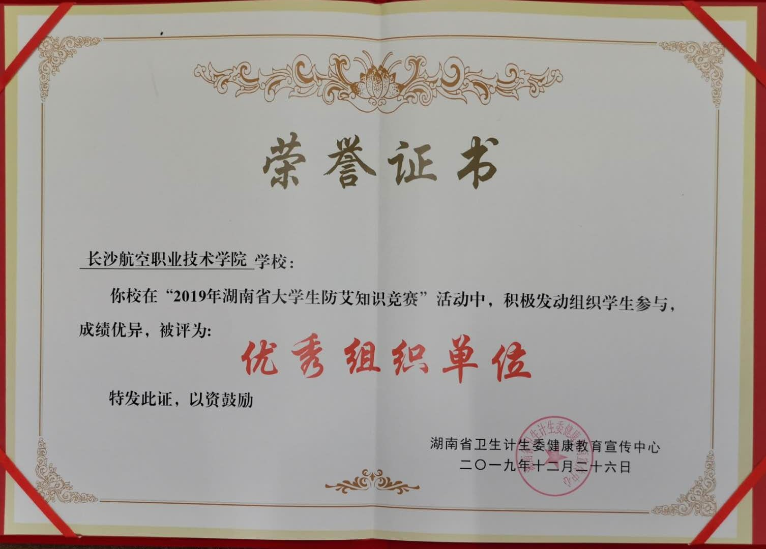 12月27日,湖南省2019年高校防艾工作总结会议在湖南省卫生健康委员会召开,我院获评2019年湖南省大学生防艾知识竞赛活动“优秀组织单位”,曹威同志获评“优秀指导老师”。