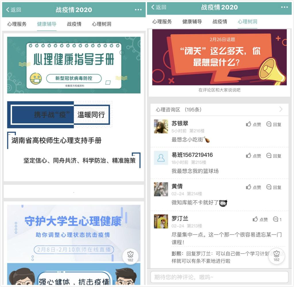 开发系统,实施“云”援助。开发易班轻应用“战疫情”进行网络心理援助,设“心理服务”“健康辅导”“战疫情”“心理树洞”等4个栏目,并将校内在线咨询其它渠道、省内外公益热线和咨询平台、疫情心理健康自助指南等相关信息传送给每个学生、每位家长。安排心育教师在线值守,及时回复易班交流、咨询和QQ、邮件咨询等来访信息。为提高抗疫心理服务专业性和实效性,心理辅导团队全部参加了专门在线心理援助培训,并反复开展在线集体工作讨论、同侪督导。