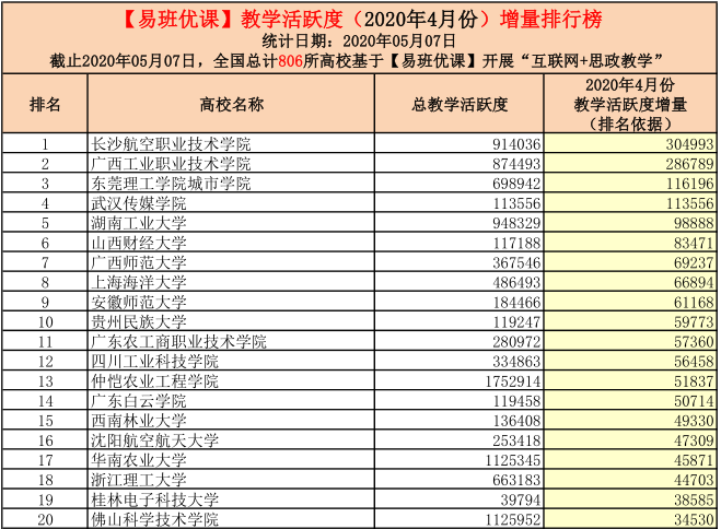 【易班优课】教学活跃度(2020年4月份)增量排行榜(部分截图)