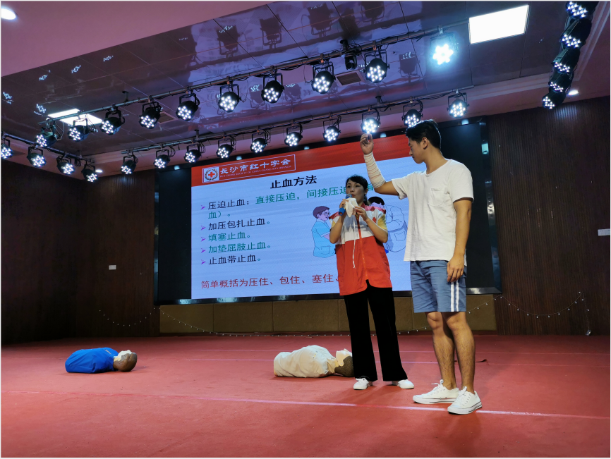 7月14日下午,受雨花区卫健委,雨花区红十字会委派,我院管理学院教师刘英来到长沙市雨花区黎郡小学为全校教师进行应急救护培训。