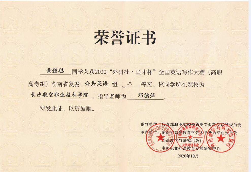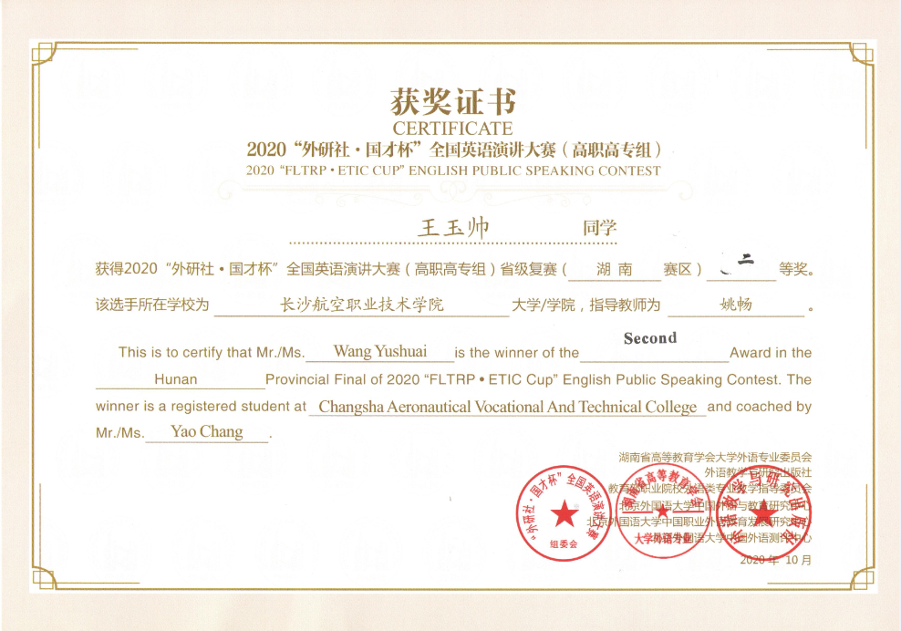 10月25日下午,2020“外研社•国才杯”全国英语演讲、写作大赛(高职高专组)湖南赛区复赛在湖南外国语职业学院落下帷幕。经过激烈角逐,我院无人机1802班黄信霖同学从全省40所院校149名选手中脱颖而出,斩获演讲比赛特等奖、发动机维修1904班王玉帅同学荣获二等奖;材料1902班黄懿聪同学获得写作比赛公共英语组二等奖。基础教育学院公共英语教研室简剑芬、姚畅、邓德萍三位老师荣获优秀指导教师奖。