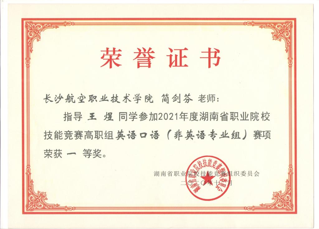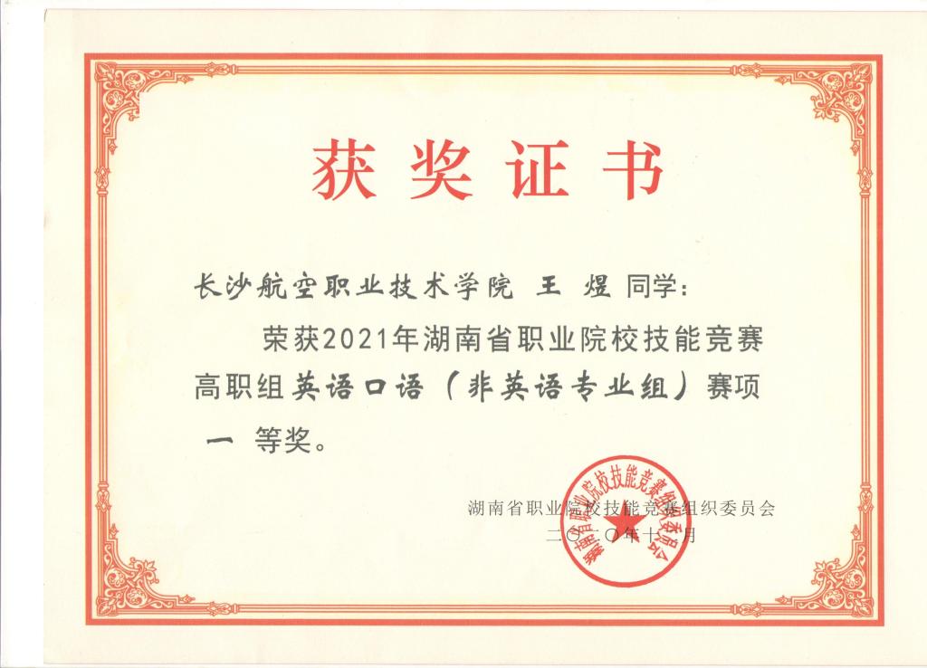 12月26日,“2021年湖南省职业院校技能竞赛”高职英语口语赛项在民政职业技术学院圆满落下了帷幕。来自全省61所职业院校的非英语专业选手在赛台上展开了激烈竞技。经过顽强拼搏,我院选手机场运行1902班王煜同学荣获一等奖,基础教育学院简剑芬老师荣获优秀指导教师奖。