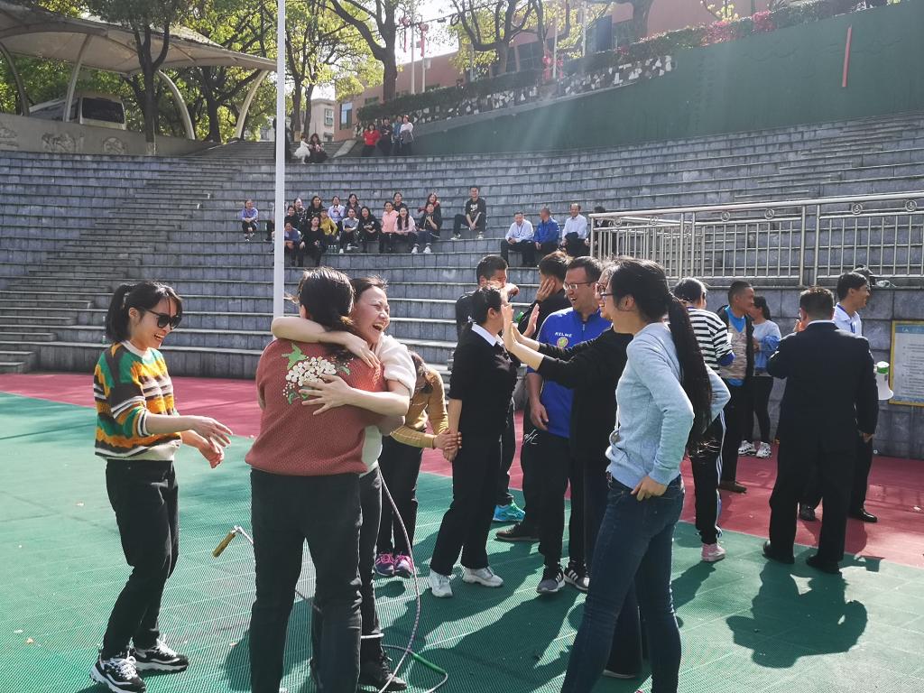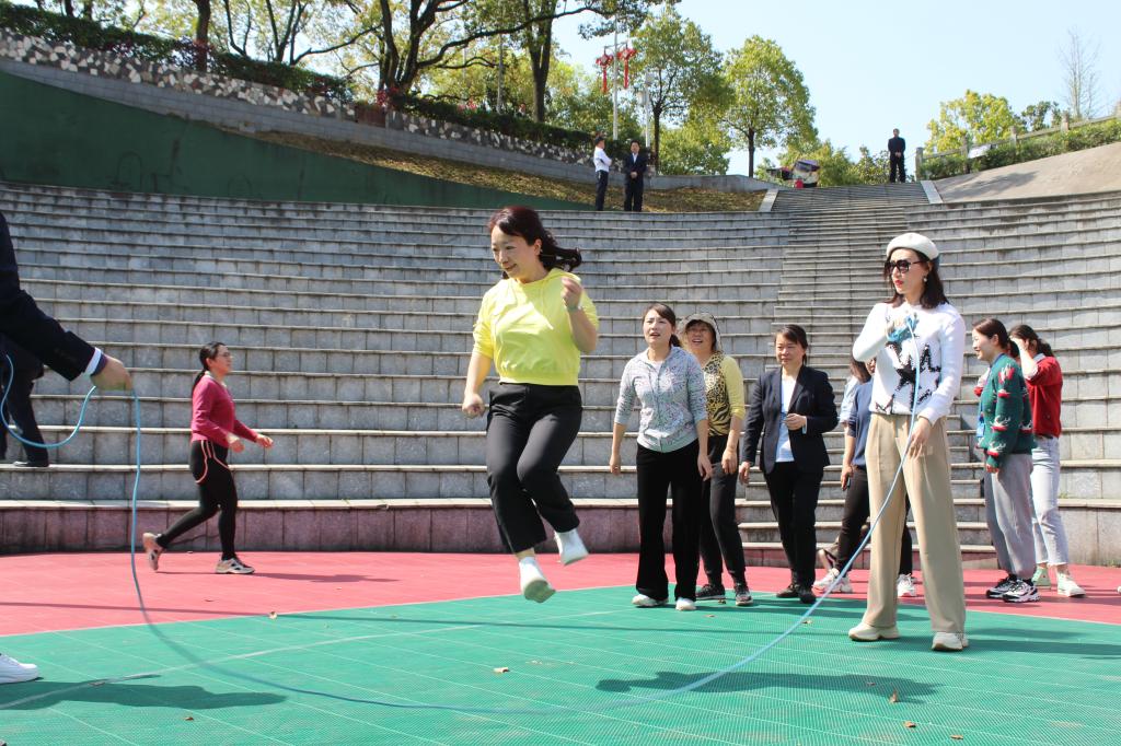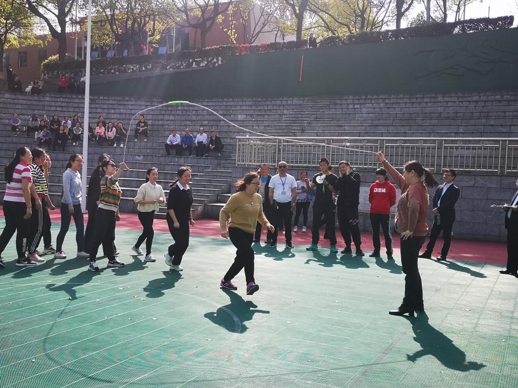 3月25日下午,初春难得的艳阳高照天气,跳马校区灯光球场上正在举行庆祝“三八”妇女节跳长绳比赛。比赛以分工会为单位,每队参赛队员为本分工会全体女教职工(含摇绳队员),参赛队员少于15人的,与其他分工会组成联队,总共组成了11支队。