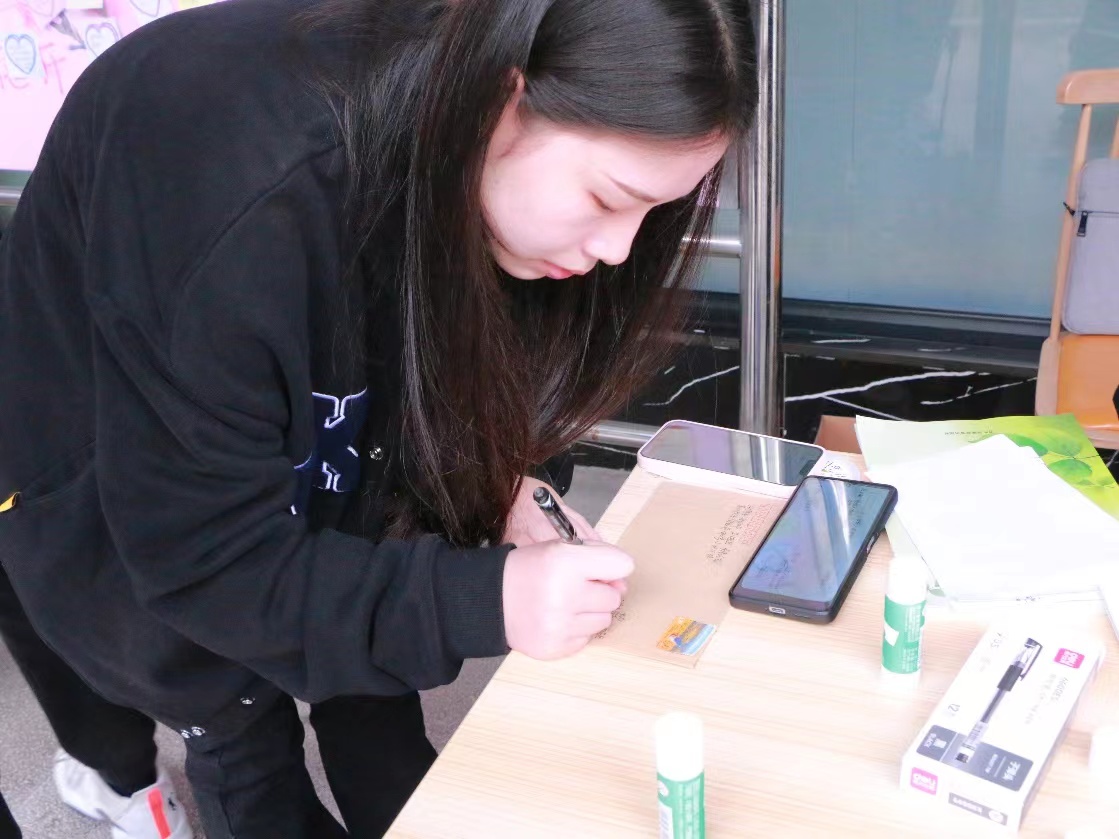 活动现场,同学们在便利贴上写下祝福话语,表达对母亲的爱。电子学院为参与活动的同学精心准备了小礼品和信封,以书信邮寄的形式为母亲送上真挚的祝福。为使信件能够顺利寄出,同学们都对照着信件的标准格式认真书写,完成后将信封放入“长航电子邮政”特制的邮筒里,由电子学院代替同学们一并寄出。