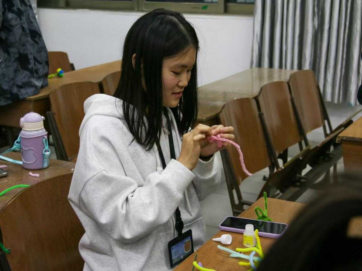 活动伊始,便进入到唇语挑战热身游戏环节。同学们两两一组,一方尽情的比划,形象的传递唇语,另一方则绞劲脑汁的猜想信息,周围观众都屏住呼吸,全神贯注的看着他们的表演,整个场地充满了欢声笑语与紧张刺激的氛围,为后续的环节开展拉开了欢乐而精彩的序幕。随着下一环节的到来,五彩斑斓的扭扭棒在同学们的巧手中不断改变,它们经弯折、缠绕,成为精致的花朵、俏皮的玩偶及各类各样的个性配饰,同学们踊跃参与,现场气氛热烈非凡,充分展现出同学们无限的创造力与丰富的想象力。