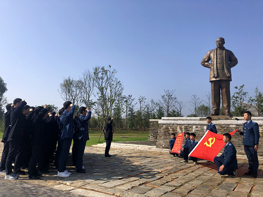 走出艺术中心,一片青山绿水、稻田村舍映入眼帘。全体师生党员来到了国旗广场合唱国歌。“起来!不愿做奴隶的人们!把我们的血肉,筑成我们新的长城……”。随着国旗高高升起,激情昂扬的歌声中所蕴含的民族精神已深深的刻在了党员们的心中。在田汉铜像广场,党员们瞻仰了田汉铜像。田汉先生身着中山装,佩戴着眼镜和围脖,双眼深深地凝望着家乡的这片火热的土地。全体师生党员在都昌兵书记的带领下,排列整齐,紧握右拳,面对党旗,重温入党誓词。