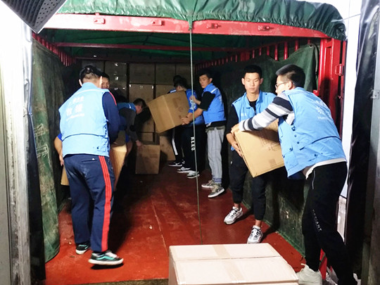 今年冬天,在省、市、区各级文明办的指导下,湖南民间联合救灾、迎接4040个温暖包成功运抵长沙,湖南民间联合救灾、群英会联合全省十几家公益机构共募集了价值100多万元的温暖包,一个温暖包里有棉衣、棉鞋、棉袜、围巾、帽子、手套、书包、美术套装、图画本、减灾笔记本、袋鼠陪伴公仔、护手霜等共11种关怀物品,价值365元,将由各在地公益团队送达桑植、平江、会同、桂阳、临武、隆回等凝冻地区贫困家庭的4040个孩子们手中,当天,基础学院13名志愿者来到雨花亭沃尔玛仓库,开始了为期一天的志愿者服务工作。仓库角落随处可见志愿者们忙碌的身影,虽然很忙很累,但是他们始终不忘自己的使命。将每一个“温暖包”包装好并送到前往受灾地区的大货车中,长时间的志愿服务也让志愿者们有了疲倦之感,但是志愿者们依然以饱满的热情去面对每一个充满爱心的“温暖包”,只为了给受灾儿童做一些我们力所能及的事。