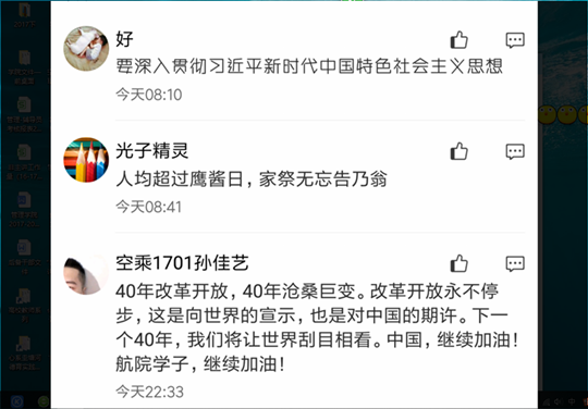活动中,全院同学以饱满的热气和昂扬的精神纷纷在“寄语强”上留言,积极发表对祖国美好的期盼和对改革开放砥砺前行的寄语。我院团总支书记写下了“40年改革开放,40年沧桑巨变。改革开放永不停步,这是向世界的宣示,也是对中国的期许。下一个40年,我们将让世界刮目相看。中国,继续加油!航院学子,继续加油!”;学生会主席留言“好好学习,天天向上,争做新时代好青年”。