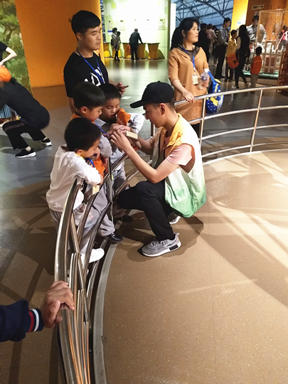 活动伊始,志愿者们以小组为单位,分工合作,散落在场馆的不同角落,他们或是为参观者讲解知识,或是在耐心回答参观者的提问,或是在为参观者提供引导服务。“太空探索”“数理启迪”“生命体验”“信息港湾”……每一个展馆里的展品都非常有趣,让人应接不暇。科技馆就像知识的海洋,解密了许许多多神奇事物的本质。在湖南省科技馆中,咨询的游客络绎不绝,其中还有许多的小朋友。志愿者们热情洋溢,积极主动地为前来咨询的小朋友们进行讲解与服务,同他们一起体验科技馆的体验设备、一起学习科技知识。