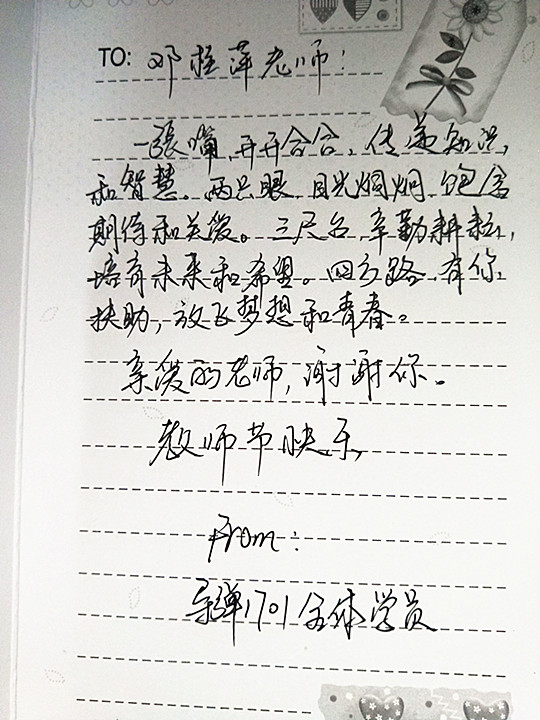 活动得到了全院学员的广泛响应,让整个士官学院都沉浸在尊师重教的喜庆氛围中,让我们从内心深处道一声:老师,辛苦了,祝您节日快乐!(士官学院 李丹 供稿)