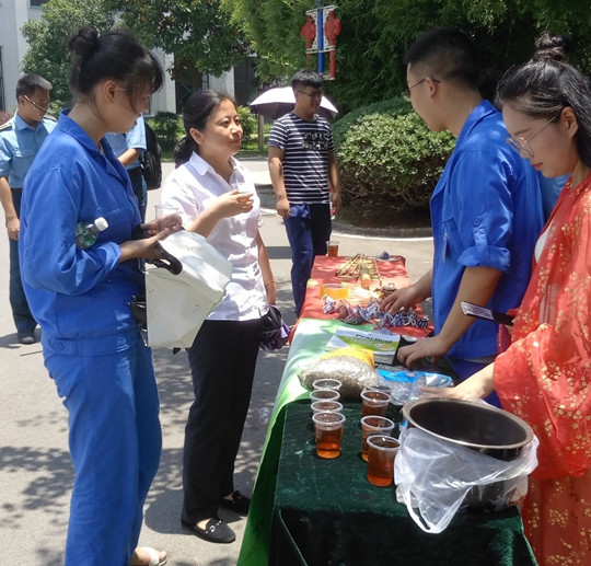 “谢却海棠飞尽絮,困人天气日初长”。随着夏至的到来,天气日渐炎热。在这炎炎夏日,怎能不来一杯消暑凉茶呢?活动开始,志愿者热情地邀请过往的师生们一起过来品凉茶,同时还热情地向大家介绍夏至时节的传统习俗。汉服社的同学向有兴趣的同学讲解中华凉茶文化的起源与发展,老师、同学们对此都表现出浓厚的兴趣,纷纷参加到活动中来。兴致渐浓的一些老师、同学还参加了志愿者们准备的射箭活动,并与身着汉服的汉服社成员合影留念。现场有很多同学领到了志愿者亲手制作的艾草香囊,开心地表示:“这样的活动太有意义了!不仅仅让我们体验了一把古代人的娱乐活动,还了解到了夏季凉茶的制作工艺和艾草香囊的功效”。