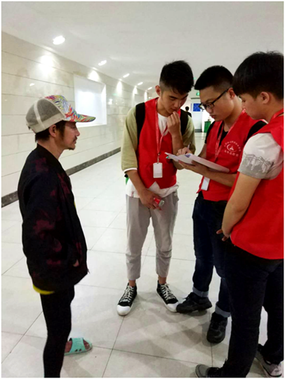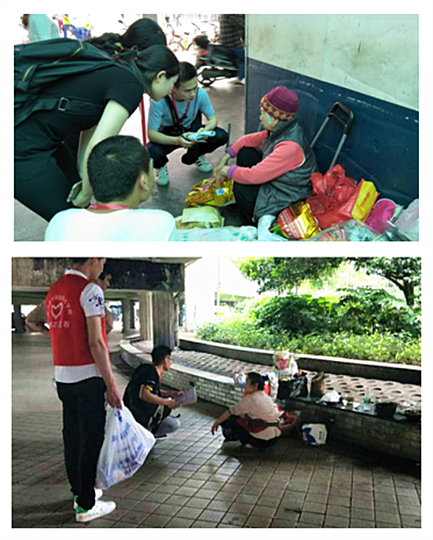 活动当天,志愿者提前分配好组别,三人一组,分别跟随一名社工进行活动。此次活动通过问卷查的方式,询问流浪者的大致情况,并对大部分流浪者进行心理疏导、劝说,告知他们救助站的具体位置,并给予一些适当的生活必需品。志愿者们走访了火车站、芙蓉广场等五处乞讨流浪者的聚集点,在走访过程中,有很多流浪者不禁让大家惊讶,他们大多都有劳动能力,有的甚至比常人看起来还要壮实,社工告诉我们现在社会上80%-90%的乞讨者都是职业的乞讨人员,他们的家庭条件并不困难,更多的是他们利用了人们的同情心、怜悯心,形成了现在这样的不良风气。