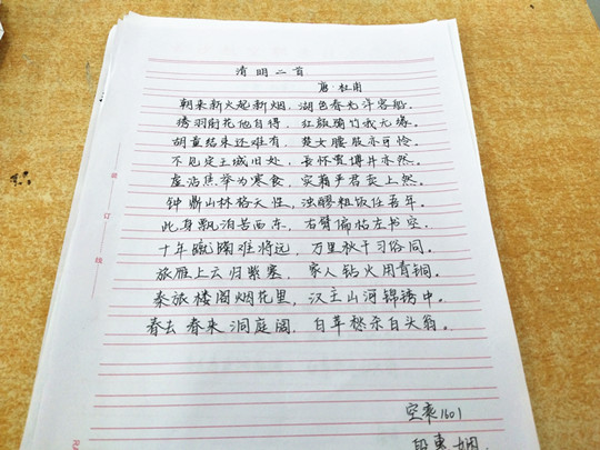 此次比赛,以杜甫的《清明二首》、万俟永的《三台.清明应制》和吴文英的《渡江云三泛.西湖清明》为题, 分为硬笔书法和软笔书法两组, 管理学院各班同学踊跃报名,积极参与,宣传部共收到作品三十余副。所有参赛的作品笔画流畅,横字形正倚交错,线条粗细变化明显,跌宕有致,一幅幅作品或苍劲有力,或隽永飘逸,或清秀雅致,彰显了同学们深厚精湛的书法技艺。经过细致的评比,安管1601班王曦同学荣获软笔书法组一等奖,空乘1604班游瑾玉同学荣获硬笔书法组一等奖。