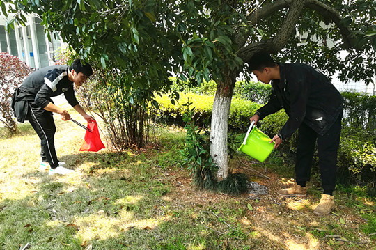 活动开始后,同学们三两成群的拿着小桶、扫把、撮箕等劳动工具对校园内各主要场所的树木进行了浇灌、松土和施肥,并对草地上的垃圾进行了清扫。但见阳光映照下,四处树木青葱,一派生机勃勃的景象。大家在感受到一棵大树的长成中蕴涵着“根基、阳光、时间、向上长”的同时,也深深感悟到我们的成长也是需要踏实的学习、阳光的心态、成长的时间、向上的目标,只有这样才可能成长为祖国的有用之才。