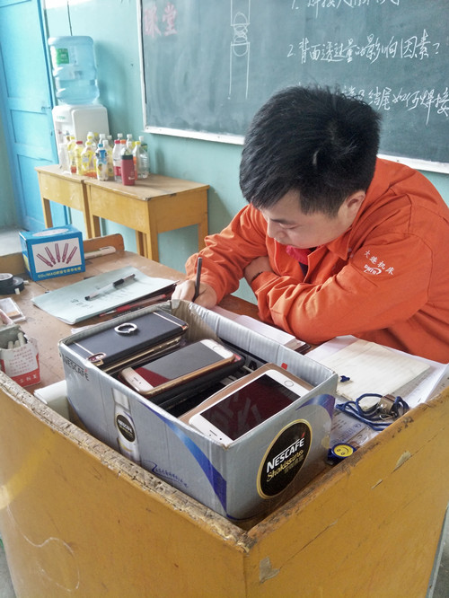 “小学上课费嘴,初中上课费笔,高中上课费脑,大学上课费流量”,这是对上课使用手机影响学习这一现象的针砭嘲讽。针对课堂上玩手机导致学生注意力不集中、听课效率降低等问题的存在,航空机械制造学院焊接专业开展了“无手机课堂”活动,倡议学生在上课前将手机关机并统一上交暂存。