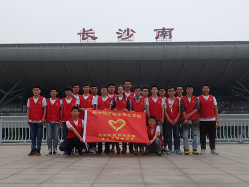5月1日, 航空机械制造学院20名志愿者与“和谐号”高铁志愿者在长沙火车南站携手开展了五一假日高铁志愿者服务活动。