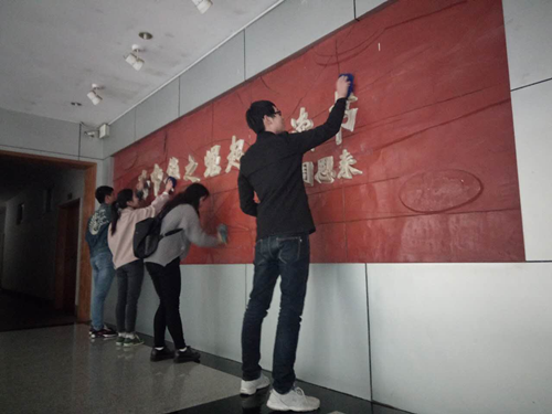 春风送暖,爱心更暖。学生干部们手拿扫帚、垃圾袋、抹布,在校园里进行大规模义务清洁,他们的身影遍布学校各个角落,主马路、教学楼、图书馆、阶梯教室、寝室等。清理了许多塑料袋、饮料瓶、废纸和树叶;对墙角、窗沿等死角一一进行“扫荡”;在校园绿化带里拾捡废纸和枯枝;拿着铲子、刷子清理宣传栏和墙上的“牛皮癣”广告。整个过程参与度高,学生们热情高涨、不怕脏不怕累,分工明细,配合默契,将周围环境做了一次彻底清洁,体验到了劳动的光荣和奉献的快乐。