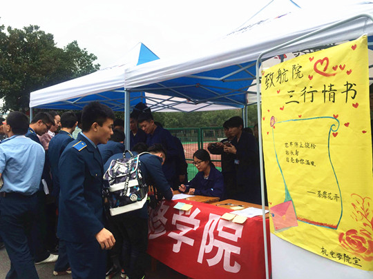 “三行情书”旨在通过短小精悍的篇幅,传达真挚深刻的情感。用激起感情共鸣的方式唤起亲情、友情以及感恩之情。今年10月初,为响应我院卓越校验收和争创全国文明单位两大建设工作,机电学院团总支特别策划了“三行情书——文明倡导服务”系列活动。活动一开始,便吸引了许多老师和同学的关注和参与。大家在表达自己真情实感的同时,也感染了越来越多的师生参与到了其中。在作品阶段性收集结束后,“三行情书”文明倡导服务小组决定将部分优秀作品展出,以达到更好的传播效果。12月27日作品展当天,展板前围满了前来欣赏优秀作品的师生,大家都在轻声地品读着这些或感人或暖心、或欣慰或励志的“情书”:爱你只需一行,不过若需两行的话,我会给你三行”、“初见你,因为热爱;了解你,所以敬仰;继承你,只为奉献”……渐渐地,品读者的声调都有了变化,传达的感情让身边的人感觉到了那份浓浓的航院情怀。师生们都表示人类进入微时代,特别喜欢这样语言简练、但又能意味深长表达情感的方式和活动。
