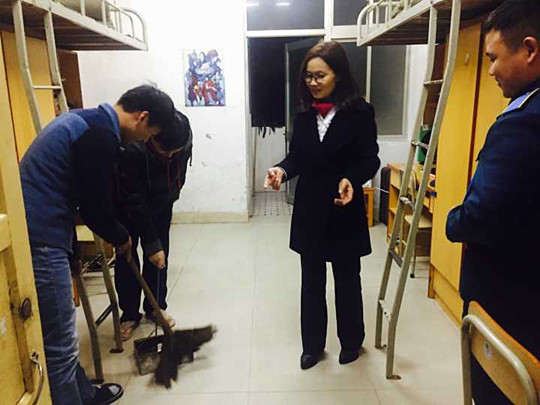 老师督促学生们打扫宿舍卫生整理内务