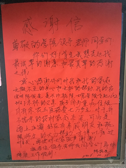 胡德军院长、司马吉凯书记将爱心款送到了陈栋同学家长手中