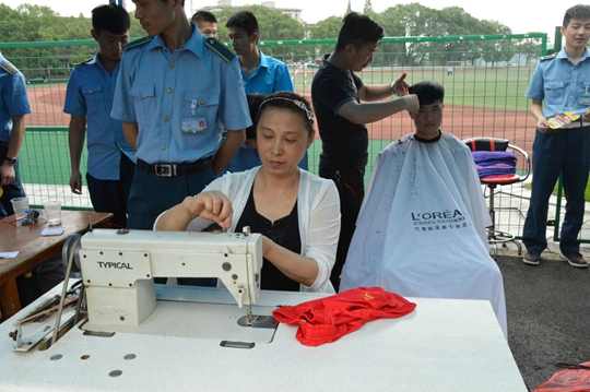 志愿者们在为学院师生免费贴膜、理发、缝补衣物等